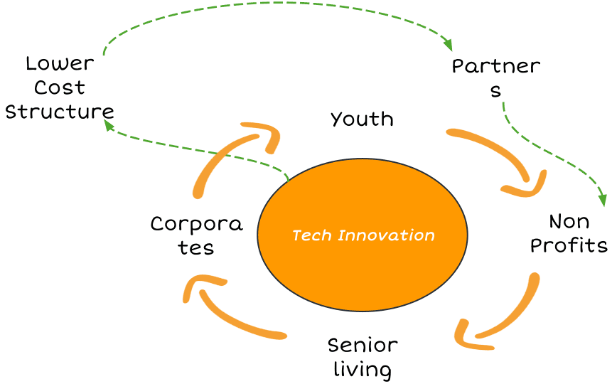 Every connection sets a powerful flywheel in motion. When we invest in youth, we build tomorrow's leaders. When we strengthen nonprofits, we amplify community capacity. When we support seniors, we create intergenerational bridges. When we advance health, we build resilient families. When we foster technology, we unlock scalable solutions. When we partner with corporates, we accelerate every spoke of the wheel. Each impact multiplies and propels the next—youth become nonprofit leaders, seniors mentor youth, technology maximizes every dollar. One connection sparks another, one impact amplifies the next, building unstoppable momentum toward a thriving American where every generation lifts the next higher.